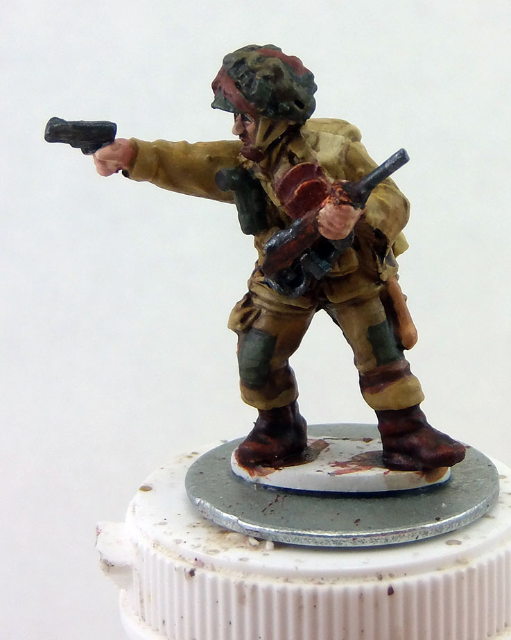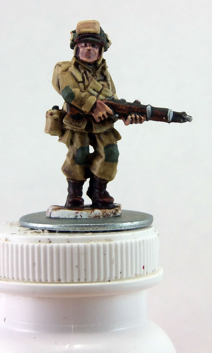I experimented with things other than Buff for the webbing, but found that I wanted the higher contrast it gave. It’s obvious there’s not a lot of contrast there to begin with, particular after everything gets hit with the strong tone. Many guides to US Airborne suggest Vallejo’s Dark Sand for highlights, but I found it too yellow. Desert Yellow is a fine substitute for the Green Ochre, though it is a little lower contrast to the various webbing options, which is why I didn’t use it. All of this is from testing on my own figures, not just theorycrafting.