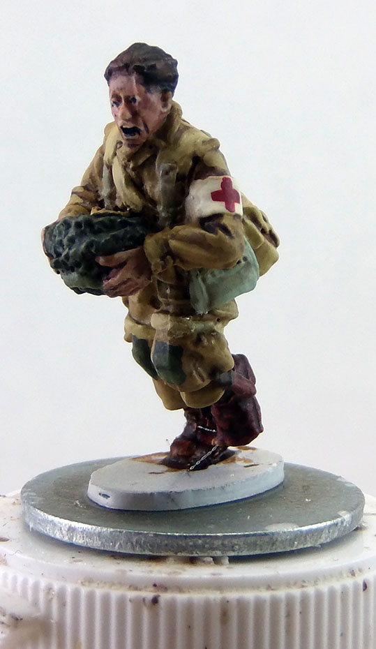 For pale green packs, like the M1936 Musette Bags made by the British for American use, I went with an even mix of Pastel Green and German Camo Beige, highlighted with just the Pastel Green. You can see these in action on the medic. His armband is done in Ivory, with a freehanded Gory Red cross. That’s from the Game Color line, not Model Color, as it was originally for my Tau. The Game Colors certainly handle better - I had Model Color paint rub off even from the scant handling during painting itself, but that’s what the varnish step is for.