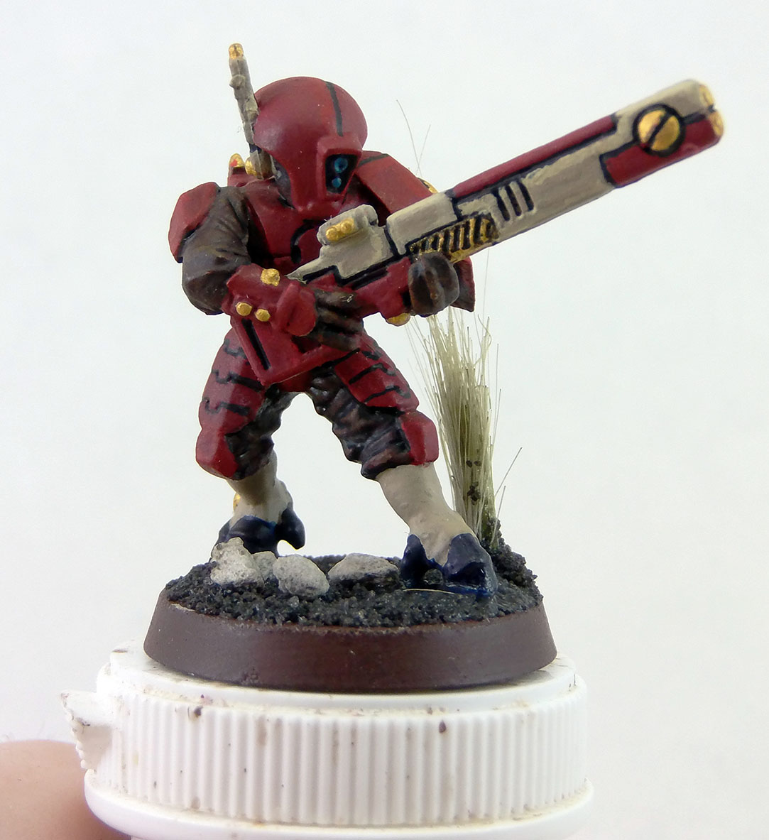 I’d gotten into painting once before, trying my hand at Warhammer 40k figures. After an abortive attempt at some Ultramarines, I settled on the Tau Empires as my army of choice. I appreciated their ‘shooty’ quality. Their armor (both worn and vehicular) has sleeker lines than most of the other factions, and I thought my wife would appreciate the mecha-inspired battlesuits. The Japanese aesthetic permeated the entire army, in fact, right down to the shaved heads with topknots and the ceremonial blades. In hindsight, it was an obvious choice.